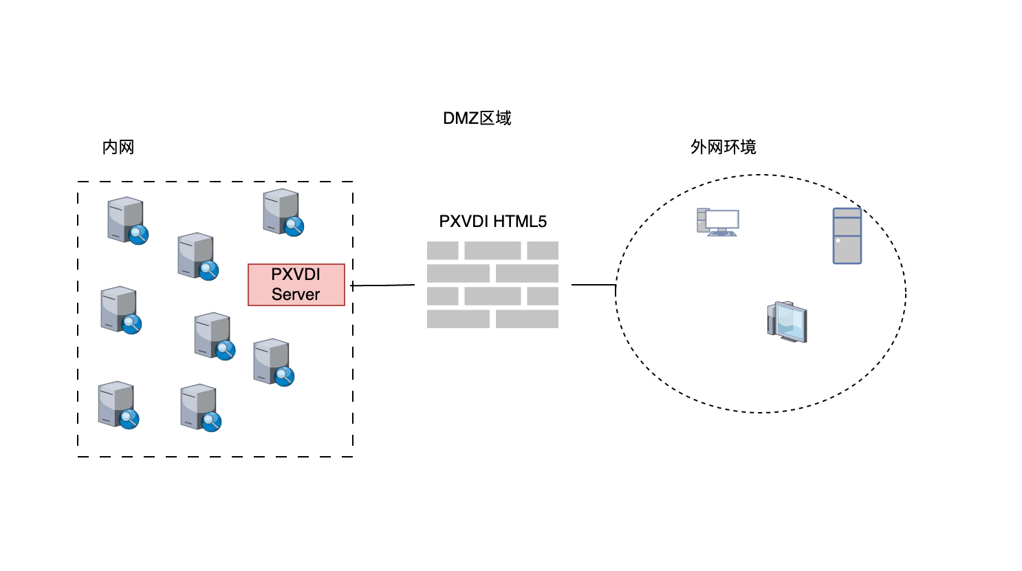 利用 PXVDI HTML5 可以创建内外网访问安全代理,外部的客户端可以通过HTML5的地址进行连接,而不需要将PXVDI 服务端暴露到公网,极大地增加架构安全性。