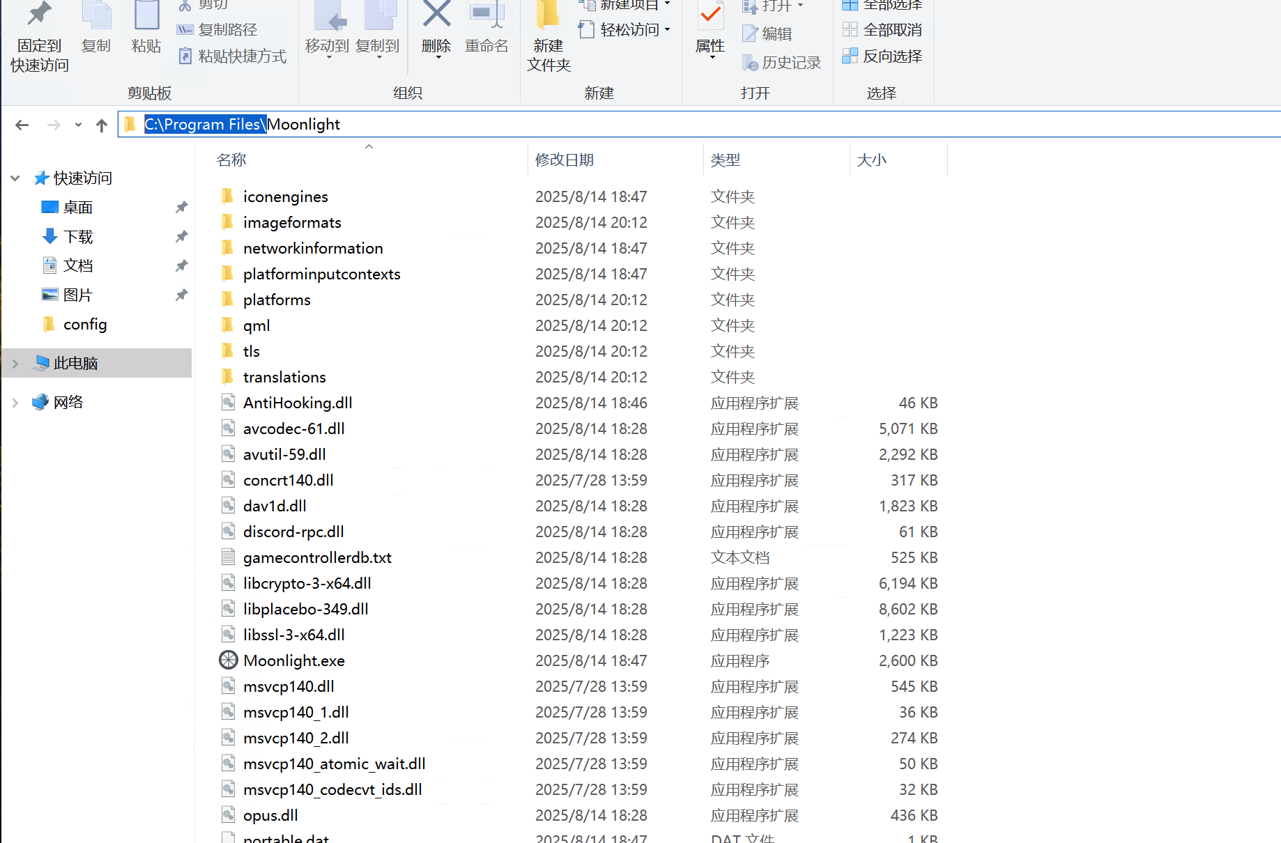 Windows是zip,请解压zip文件,确保文件夹名为Moonlight,移动到C盘C:\Program Files\下面。一定要路径正确。如下